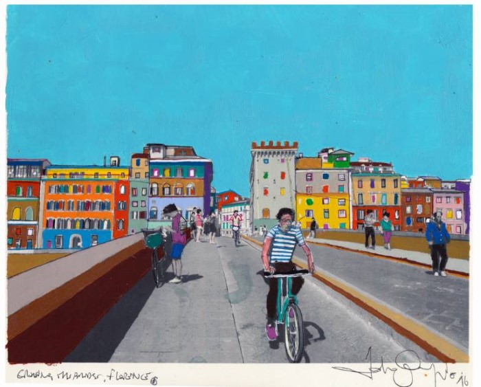 «Провокационный и иронический язык Фабио Коруци, описывающий сценарии социальной жизни нашего общества, почти зеркально отражает культурную реальность. Наше метропольное общество, зажатое, как он говорит, «между бетоном и асфальтом», анонимные фигуры, хаотические пространства, сцены городской жизни, женщины и мужчины в своей рабочей среде, спортсмены и хулиганы на спортивных мероприятиях, движение города, беспрестанно текущее в работе Фабио Коруци — это то, чему автор был свидетелем» — искусствовед Мария Винелла.